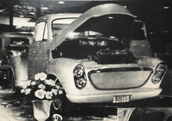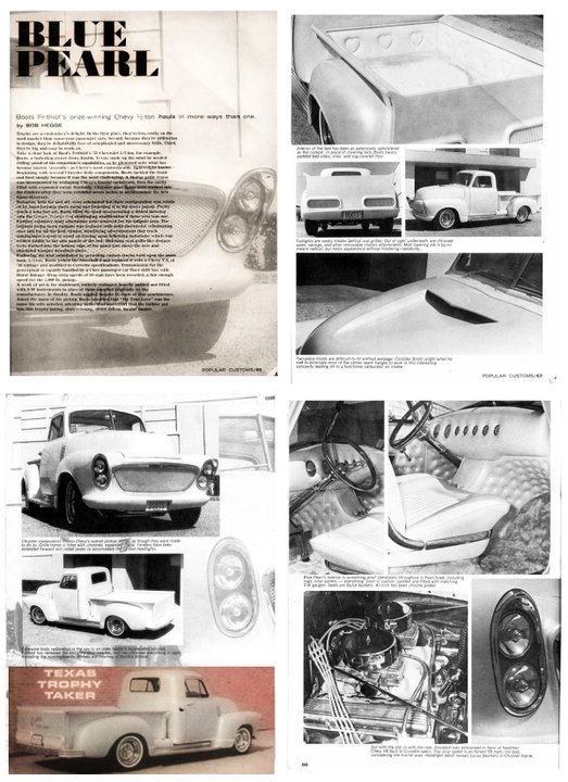 Boots Frithlof was a body shop owner from Austin, Texas who built this custom truck, for the classic custom car lovers world, a bit of a twist…move over! -in Texas we use trucks to show our skills and back in the 60s nothing fit the bill better than this fully customized truck known as the “Blue Pearl.” It was a 53 Chevrolet 1/2 ton labeled in Car Craft of April, 1964 as the -Texas Trophy Taker. So, if you’ve hung around in Austin awhile…well then maybe you will remember this truck. Belonging to one of Austins earliest of car customizers. Over the years when this truck competed at major shows Boots and Texas famed upholsterer Vernon McKean re-did the paint and interior 3 or 4 times over to keep the truck fresh and different ready to win at shows. quote- When asked the name of his pick up, Boots admitted that “My True Love” was the name his wife selected, attesting to the time and effort that the publisher put into this trophy-talking, show-winning, street driven, haulin hauler.